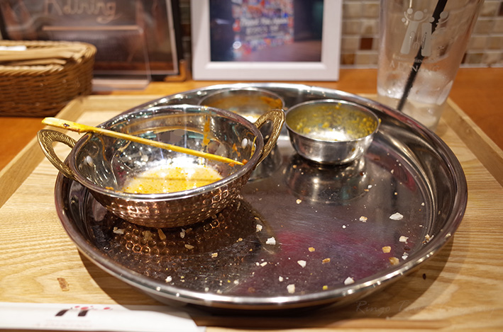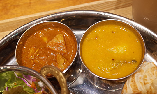 カレーは、チキンカレーと豆カレーの2種類のカレーを楽しむことができます。どちらも食べやすくて量も多すぎずいい感じでした。チキンカレーの方が少しスパイシーでした。