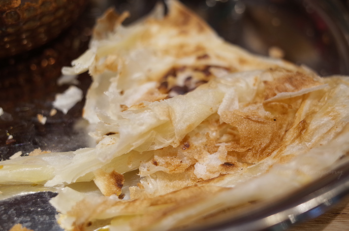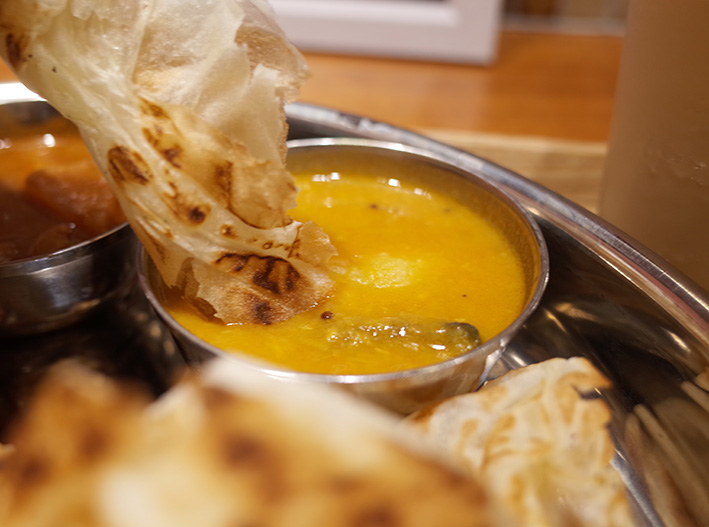 ロティーチャナイは、ぱっと見「薄く伸ばしたナン」みたいなのですが、外はパリパリ、中はモッチモチでよく伸びます。