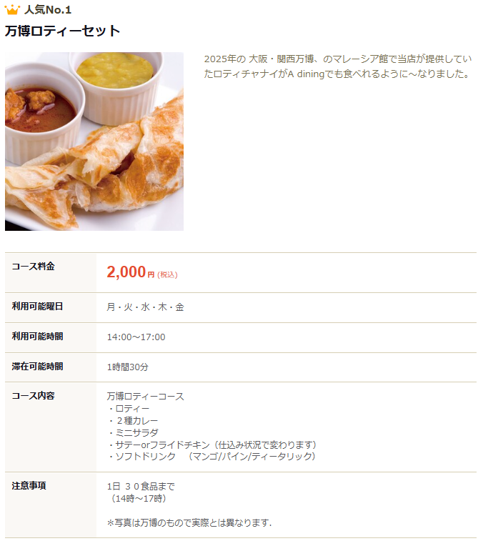 2025年12月時点では、万博ロティセットは予約必須です。
